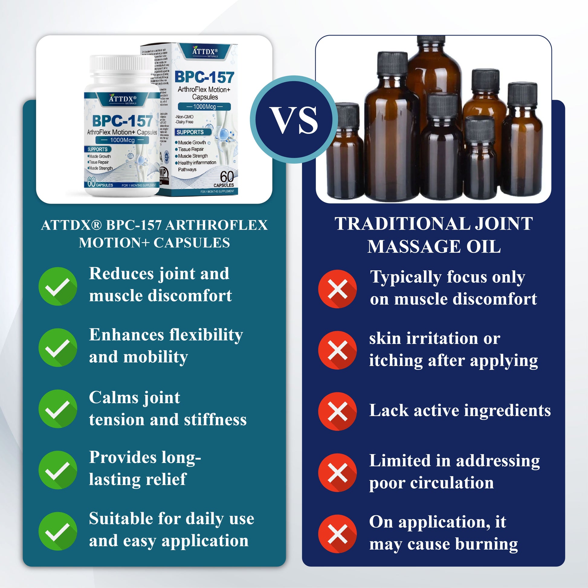 By acting at the cellular level rather than just cushioning joints, ATTDX® BPC-157 ArthroFlex Motion+ Capsules provide a reliable approach to long-term musculoskeletal health.