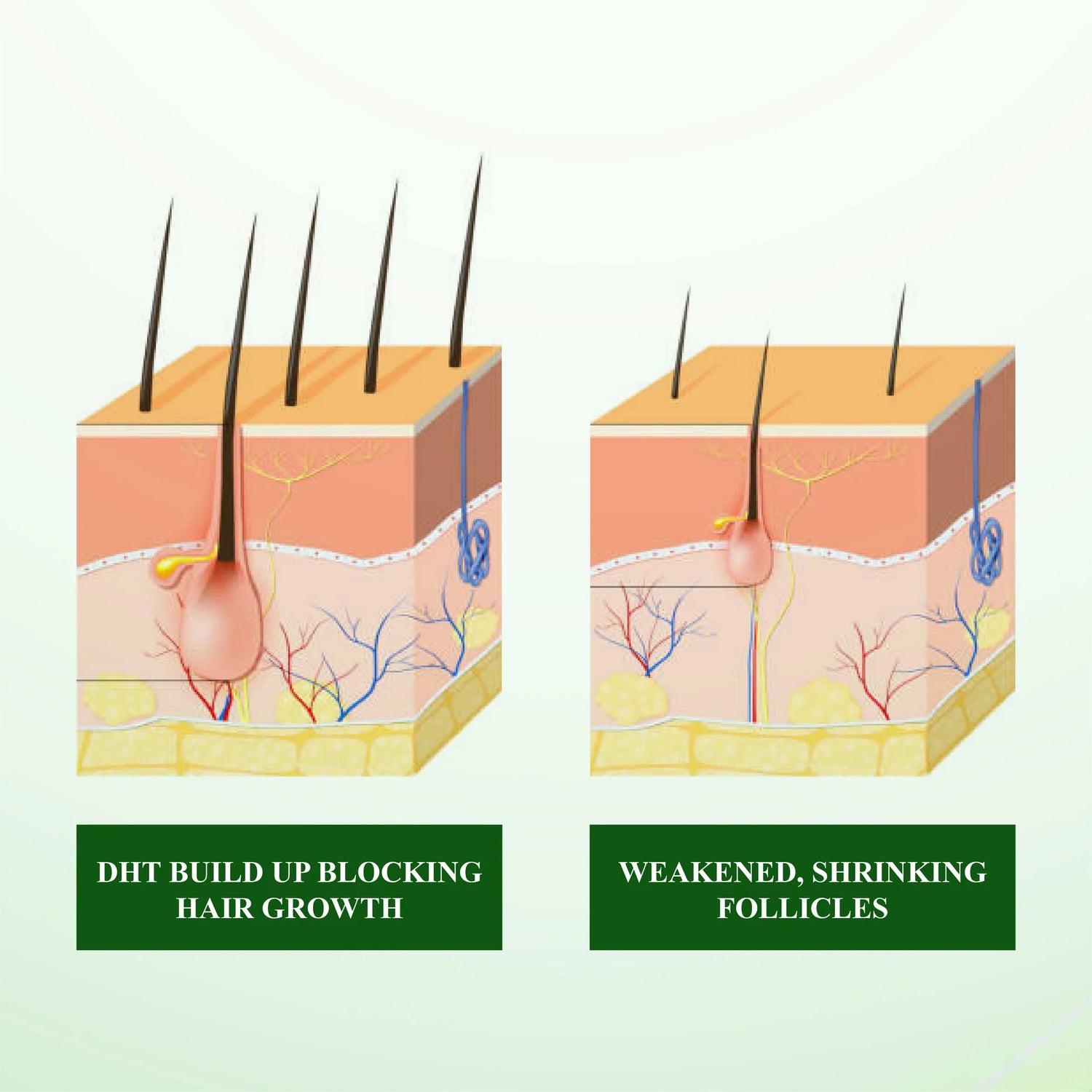 Every day, DHT buildup, poor circulation, and nutrient loss weaken the roots, leaving hair thinner, weaker, and more prone to shedding.