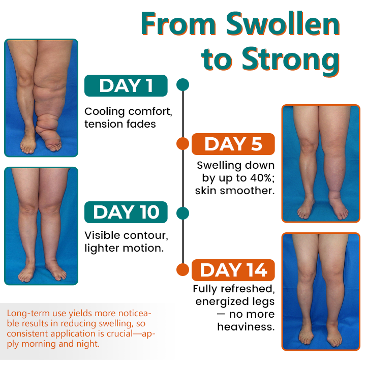 Many users feel immediate cooling and softening of tightness from the first use. Visible reduction in swelling commonly appears within 5–7 days of twice-daily use, with more defined results around Day 10–14. Consistency matters — keep rolling morning and night.